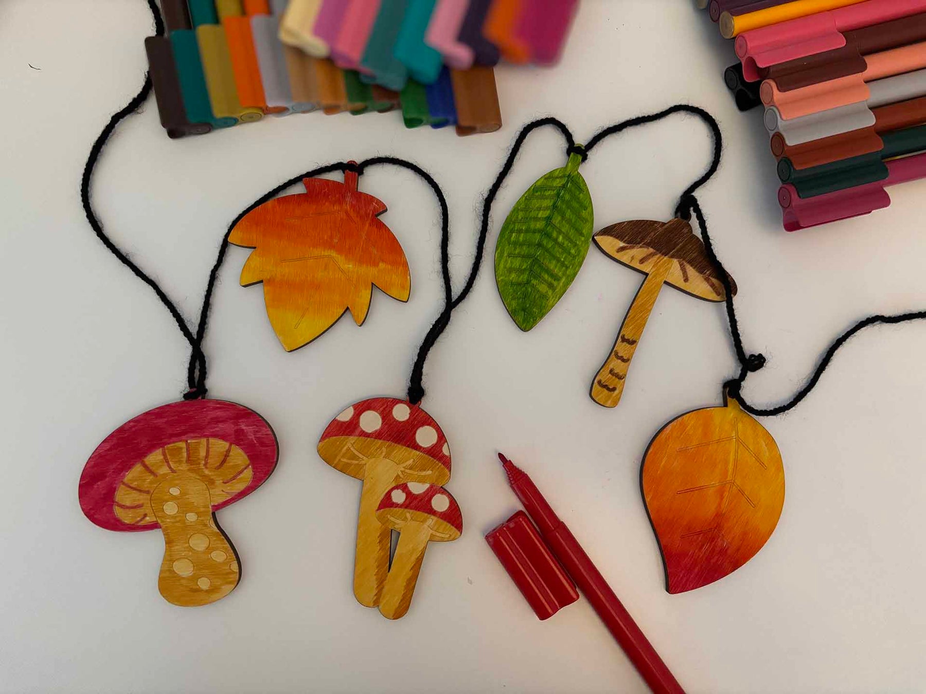 Pilze & Blätter aus Holz – ready zum Bemalen und Auffädeln.