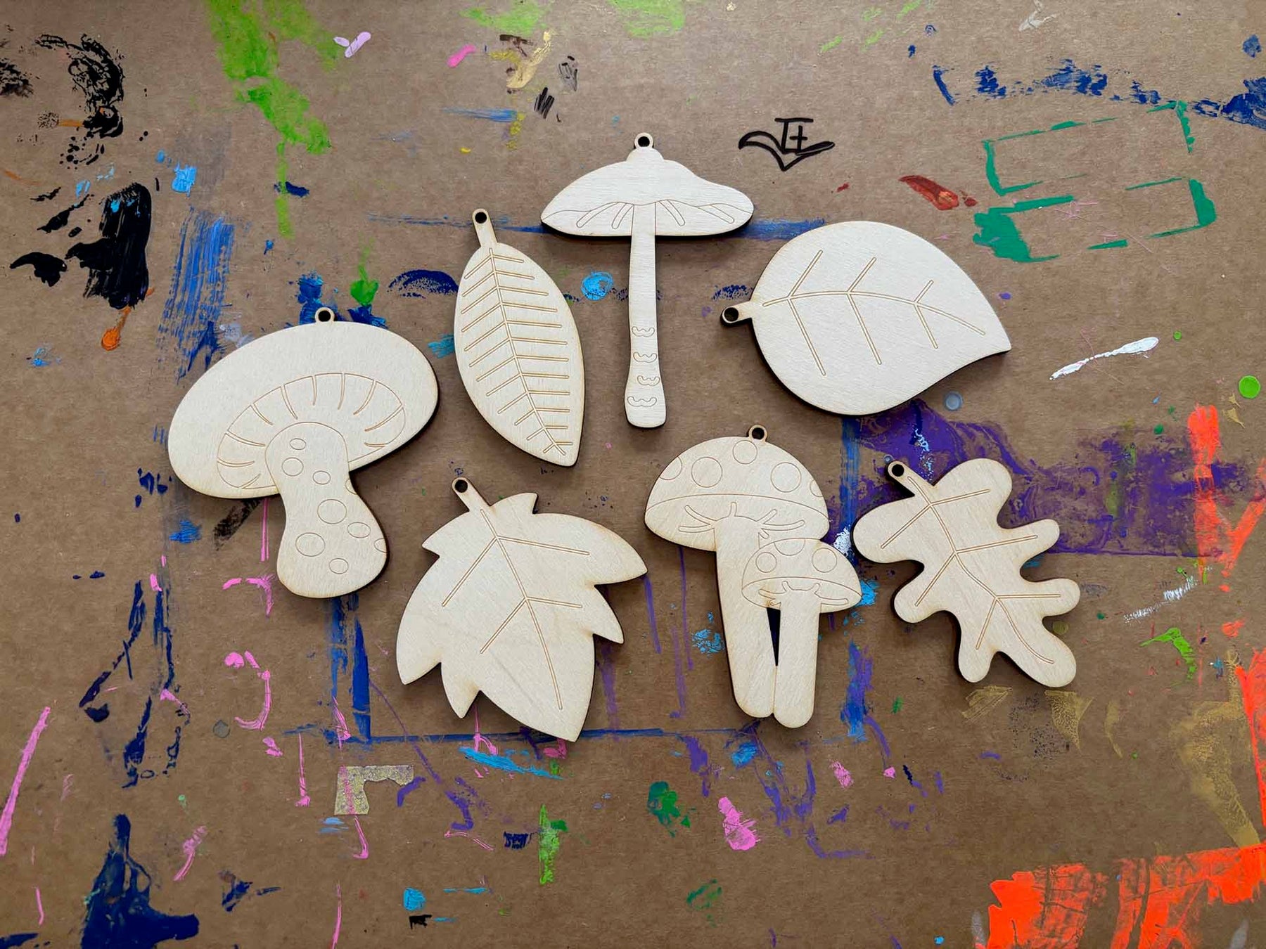 Sieben Motive: drei Pilze (Doppelpilz, Schirmpilz, Waldpilz) und vier Blätter (Ahorn, Birke, Buche, Eiche). Ideal zum Auffädeln als Girlande, als Geschenkanhänger oder für Zweige. Unbehandelt und gut zu bemalen – mit Filzstiften oder Farbe.