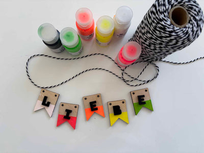 Du wählst die Anzahl der Holz-Wimpel (1 EUR pro Buchstabe/Wimpel) und gibst deinen Wunschtext an. Die schwarzen Buchstaben werden zum Selbstaufkleben mitgeliefert – so kannst du die Wimpel bei Bedarf zuerst bemalen oder kreativ gestalten. Außerdem enthält die Lieferung eine passende Menge schwarz-weißes Bäckergarn zum Aufhängen.